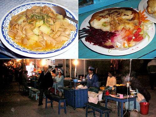 昼間食べたパスタスープが意外においしく、市場の別の店でも食べてみた。見た目は宜しくないが、ファルファッレとジャガイモがたっぷり入って牛肉だしの効いたピリ辛のパスタは、昼間のと違ってまたおいしかった。屋台ではレイェーノ・デル・パパスをサラダ付きで注文。マッシュしたポテトの中にイクアレプトという葉でカレー風味に炒めたひき肉と野菜の具を入れて、水溶き小麦粉を付け揚げた物。これは旨い。
