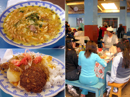この時期、ボリビア各地からの修学旅行生が押し寄せて、市場の食堂は大盛況。12時半頃行ったら、いなごの大群が通り過ぎたように、何もかも売り切れ。やっとのことで食事にありつけた。パスタスープは牛肉だしでジャガイモ入り。私はこれだけで充分。夫は更に、恐らく昨日の残りのミラネーゼの煮込みと小麦粉多しのハンバーグのセットをセグンドに。こっちの味は今ひとつだった。
