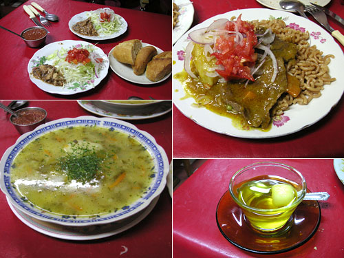 ラ・パスの旧市街にあるサガルナガ通りの1本隣の通り沿いにある大衆レストラン「ARAYA」の昼定食はB10(約150円)で、ご覧の通りのフルコース。女性にはちょっと多すぎる量だ。前菜のサラダの横に添えられたのは魚の缶詰だったり、ステーキのソースが日清カップヌードルのカレー味にそっくりだったりするが、ほぼおいしい。特にスープが具だくさん。デザートは黄色い甘い液体に洋ナシが浮いていた。