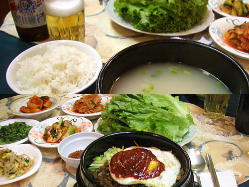 献立: 牛肉スープ、ビビンバップ、プルコギ、ビール、水