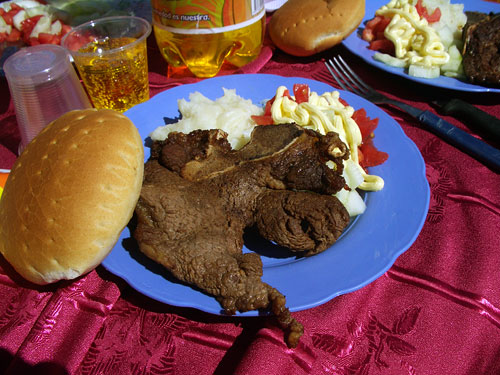ツアー2日目のランチは、塩湖の中にある魚の形をした島、Isle de Pescadoを1時間上り下りした後、島の麓あたりにテーブルをしつらえてピクニック。運動した後、この景色、この空気の中、輝く太陽の下で食べる食事は最高においしかった。特にステーキにはウユニ塩湖の塩が使われているのだろうか、リャマの肉の味と相まって、とてもおいしく感じられた。またフレッシュなトマトとキュウリが全体を引き立てていた。