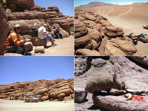 昼食で出た野菜の切りくずを石の上に置いておくと、ウサギのようなビスカッチャがやってくる。ここはビスカッチャがたくさん住んでいるからビスカッチータスと呼ばれているそうだ。食事は皿に持って、みんな思い思いの岩に座って食べる。食後は、溶岩に登ってみたり、ビスカッチャと写真を撮ったり、壮大な風景の中でのピクニックを大いに楽しんだ。それにしても、ボリビアの自然は何とすごいのだろう。