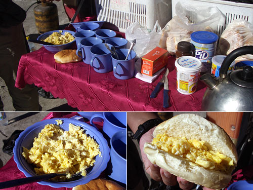 ツアー4日目、最終日は4時に起床して温泉までたどり着き、8時に朝食となった。朝風呂、そして雄大な景色の中での朝食は、ここまで来ないと決して味わえない格別の物である。しかも、最終日の朝食とあって、今までバターとジャムだったのにスクランブルエッグが出て、メンバー全員大喜びだった。調理を見ていたが、標高が3800mくらいあるので、なかなか卵が固まらない。ここで卵料理は贅沢なのだ。