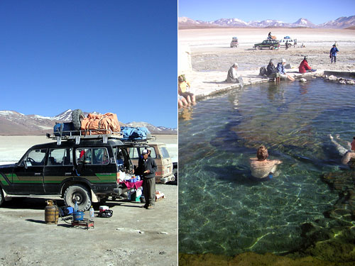 車が停まっているのは、塩の吹いた土地。近くにはきれいな温泉が湧き出ていて、遠くには雪を筋状に残した山々が見える。食事ができるまでの30分間、温泉にでも入っていてくださいと言われたので、さっさと水着に着替えて温泉に入った。いやー、こんなに広々した景色の中での露天風呂は、初めてかもしれない。お湯はそんなに熱くないが、20分もつかっていたらジンワリと暑くなってきた。最高の朝風呂だ。