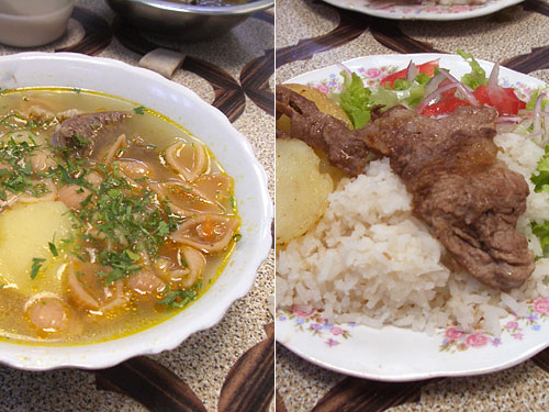 スープはじゃがいもがほぼ丸々1個とだしに使った牛肉のかたまり、そしてパスタが入った牛スープ。この市場にある食堂では、たいていこのスープを出しているが、微妙に味は違うようだ。セグンドは、リャマのステーキということで、ちょっと筋っぽい。が味はいい。リャマの肉は牛肉の食感で羊の肉のような味がする。噛みしめる度に味が出てくるような、そんなイメージである。