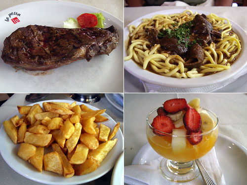 私のステーキセットは、2〜3cmはあろうかというステーキが血をしたたらせて登場。さすが牛肉で有名なアルゼンチンだ。これに大量のポテトとフルーツサラダがデザートについてきた。肉は臭みがなく柔らかい。ふーむ、これがアルゼンチン牛か。おいしい。久しぶりに標高の低い所でフライドポテトがからっとしてうれしい。フルーツもグッドだった。夫はパスタ。また手打ち麺で太めで卵入りだった。こちらは微妙。