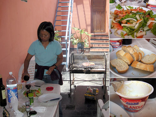 昨日から今日の昼にBBQをしようと画策していた。幸い前の宿泊者が残していった炭もある。昼前にスーパーでステーキとパンとワインを調達してきた。BBQもここに至っては、かなり慣れてきた。ガスコンロに炭を直接置いて火をつけると、ほんの数分で火がおこってくる。BBQセットに炭を移して、ちょっと下からフーフー吹いてやれば20分程で準備OKだ。このパンにはクリームチーズベースのパテが合う。