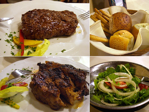 まずサラダは、オリーブかコーン(マイス)のオイルを選ぶとウェイターが調味料セットを持ってきて味付けしてくれる。そこから待つこと30分、じっくりと網焼きされたステーキ。夫のメダイオンはキメの細かい上質な赤身の部分で厚さ2cmほど。私のBife de Chorizoは厚さ3cm以上はある脂身と皮もついた部分だった。どちらもとてもやわらかく、そして肉の味がおいしい。というわけで、大量の肉なのに食べられてしまった。もたれることもない。