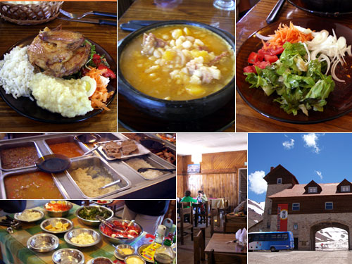 ツアーで連れていかれたレストランは、後ろに氷河を背負ったチリ国境近くの寒ーい所。山小屋風のレストラン内は昔懐かしい石油ストーブで暖かかった。北アルゼンチンの代表料理ロクロはもう初夏なので食べられないと思っていたら、ここで遭遇。豆と牛肉とベーコンなどを煮込んだ具沢山のスープはとてもおいしかったメインプラスビュッフェでサラダなどを選ぶ。。私が選んだ鶏肉はぱさぱさでNG。