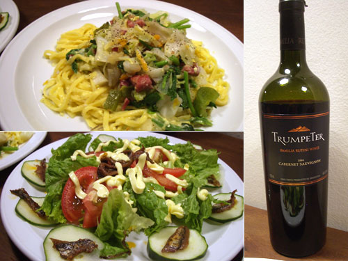 ラ・ルラルで購入したTrumpeterのカヴェルネ・ソーヴィニヨンは最高級品ではないが十分においしい。スーパーで買ったタジャリンの生麺は本当はトマトソースの方がワインにあったかもしれないが、今日は炒めたキャベツ・ベーコン・野菜に卵を絡めてカルボナーラ風にした。プラスチックケースで売られていた手作り風のアンチョビは塩っぱいだけでサラダにも合わなかった。