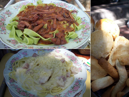 献立:ほうれん草入りフェットチーネ・イカのトマトソース、卵入りスパゲッティー・ベーコンのベシャメルソース