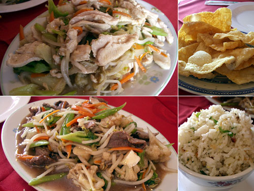 朝からバスに乗って国境越えをして、気がついたら朝も昼も食べないうちに4時近く。猛烈にお腹が空いたのに、期待していた和食レストランはシエスタで閉まっていた。ということでその近くで開いていた中華レストランに飛び込んだ。炒め物2品と揚げたワンタンと炒飯が付いた2人用のセットで、満腹、満腹。中国の人は、シエスタもなくお店を開けてくれていて、本当に助かりました。味のレベルは普通だけど、空腹は何よりの調味料でしたね。