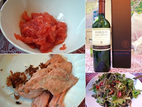 ペンシオン内藤での最後の夜、またしても下のレストランから鮭のあらがやってきた。骨の周りの身を削って中落ちにして、ハラミは軽く塩コショウしてソテーにして、今日買ってきたキッコーマンの醤油をたらす。残った野菜は野菜炒めに。これにMARQUESの濃厚な赤ワインがあれば、一流レストランなみの満足感が得られる。それにしても、この宿で食べた鮭、本当に美味かった。