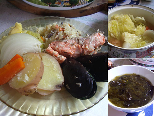献立:ムール貝と鮭のリゾット、野菜の塩茹で、わかめのスープ
