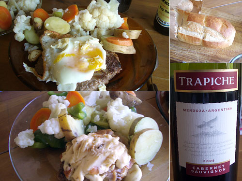 ここの牛肉があまりおいしくなかったので、ミンチでハンバーグにすることにした。夫は目玉焼きのせ、私は先日のチーズフォンデュの余りをのせた。牛100%なのでフランスパンを牛乳でふやかしたものを混ぜたが、それでも固めのハンバーグ。でも硬いステーキよりはずっとおいしかった。ワインはメンドーサのトラピチェ。有名なラ・ルーラルの近所の畑だけどお値段が安い。これはなかなかおいしいと思った。