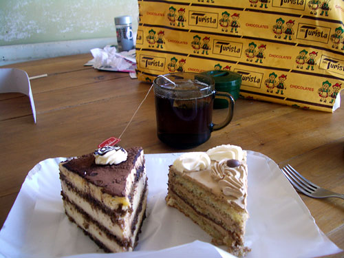 スイス人移民が多いために、名産の一つはチョコレート。町中には甘い誘惑のお店がいっぱい。ついに今日はDel Turistaという大きなチョコレート屋さんでケーキを買ってきた。左はティラミス、右はチョコクリームをサンドしたくるみ入りスポンジケーキ。味はおいしいんだけど、お店ですでにカットされて売っているのでカット面が乾いてガビガビしているのが残念。別の店も試したいなぁ。