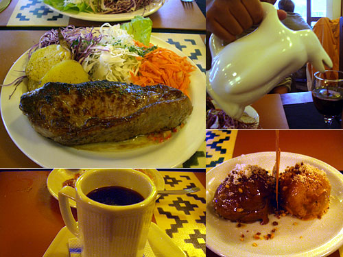 ステーキセットは茹でジャガイモのソテーとサラダ付き。セットという概念が少ないアルゼンチンで珍しい。肉はここでも柔らかくおいしかった。調子に乗ってデカンターの赤ワインを頼んだら、ペンギンの入れ物に入ってきた。いやー、愉快、愉快。ついにデザートまでオーダー。ドルチェ(甘い)という名のデザートはキャラメルと練乳を凍らせたようで本当に頭の芯が痺れそうに甘かった。