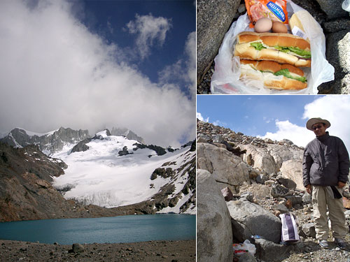 フィッツ・ロイ山を間近に見られるというロス・トーレス湖まで4時間かけて歩いてきた。目の前のエメラルドグリーンの湖、背景の氷河や山を楽しみながらの昼食。肝心のフィッツ・ロイ山は雲にかくれて全容は見えなかったのが残念だった。辺りの強風を避けられるように大きな岩の陰を探して、腰を落ち着けた。サンドイッチにはサラミ・チーズ・レタスが入っている。味は普通。歩いて疲れて風も冷たいし、本当は熱いラーメンが食べたかった。