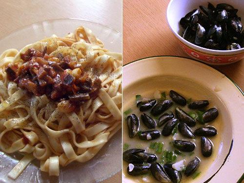 献立:牛肉とナスのトマトスパゲッティー、ムール貝(頂きもの)
