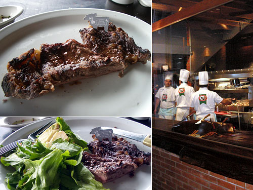 メインは牛、鶏、魚、羊とあるがここはやはり牛。通常のステーキは500gくらいありそうなので、子牛のステーキ800gを2人で分けることにした。これにサラダ。店内にはオープンキッチンのグリルがあって、そこで焼いてくれる。今回はシェアなので夫に合わせてウェルダンにした。ウェルダンでも柔らかく、筋や脂までもおいしい。「今が食べ時!」とメッセージの書かれた牛のサインがささっているのが可愛かった。