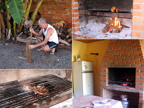 今いる宿Peter PanにはBBQ用のカマドがある。イスラエル人が毎夜のように肉を焼いているのを見て、いつの日か我々もやろうと虎視眈々と狙っていた。そして今日、チャンスがやってきた。薪があるので、それをガスバーナーであぶったのだが炭ではないので火がつかない。実はこれはパラグアイ方式で、木を細かく切って薪で囲いを作ってこの木を燃やす方式なのだ。宿のお父さんに頼んだらすぐ着火。