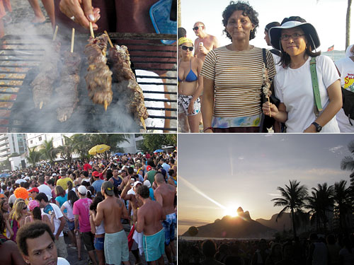 リオのカーニバルを控えたイパネマの夕暮れ時は一般人参加のパレードも出て大混雑。そんな中で炭桶と網1枚で商売しているおばちゃんの牛串焼きで夕食。払った、払ったといってただ食いしようとするイタリア人を笑ってあしらう腕前はさすがに百戦錬磨。ちょっと生っぽいので一口ごとに網に戻して焼きながら食べさせてもらった。小麦粉の粒?かりかりするモノと辛いソースをつけて食べるのがブラジル風。祭り時、売れ行きは上々だ。