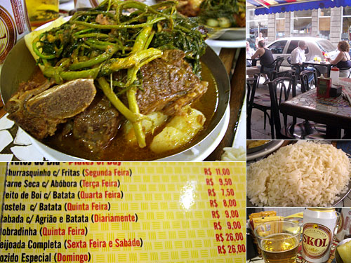 近所の食堂のメニューは何だかさっぱりわからない。色々類推して注文したら、要は牛肉の部位違いで全てジャガイモとつる草の煮込み料理だった。てんこ盛りのご飯もついてきた。私のはCostelaという部分であばらの部分。夫のはRabata(ハバータ)、牛テールだ。ハバータの煮込みはサン・パウロでも食べた。ポピュラーな一品だそうだ。おいしいけど、ご飯もバターライスで、なにもかもこってり。苦いつる草が唯一の救い。