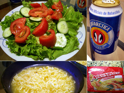 ホテルからフラット(アパート)に移ってきて自炊一発目はラーメンとサラダ。日清インスタントラーメンが買えるという驚きもさることながら、野菜類が安いことにびっくり。サラダ菜は1株R$0.76(=US$0.34)、トマト1個R$0.25(=US$0.12)、キュウリ1本R$0.17(=US$0.08)、緑パプリカ1個R$0.32(=US$0.15)。今日のサラダだけでR$1.35(=US$0.64)となる。農業大国のブラジルを実感。これがまたおいしいのだ。 |