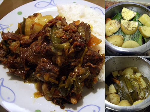 玉ねぎ、トマトの乱切り、牛テール、人参、ポロねぎ、じゃがいもと鍋につめて、塩・コショウして水200mlくらい入れて蓋をして、とにかく1時間火にかけた。圧力鍋なんて初めて使うので、途中で爆発したらどうしようかと心配だったが、大丈夫だった。写真右下は1時間後の写真。まだ肉が堅かったので、更に1時間。ん?焦げ臭い。と思って蓋を開けたら焦げていたが肉はもうとろとろ。もっと水を加えるべきだった。