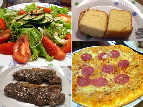 先日の冷凍ピザが今一つだったので、今日は冷凍していないピザを買ってきた。生地が薄いので、カリカリになりすぎないように焼いたら丁度いい堅さの生地に焼きあがった。これだけじゃ寂しいので、と買い足してフルコースバージョンになってしまった。特にブラジル料理ではないのだが、野菜のおいしさ、コントラ・フィレステーキ、近所のスーパーオリジナルのケーキと、どれもブラジルで出会った味だ。