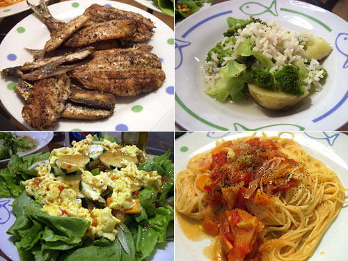 献立:鰯の香草焼き、トマトパスタ、サラダ、ジャガイモとブロッコリーと米のスープ、ビール350ml×2缶