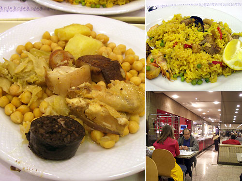 地下にはカフェとその奥にビュッフェ形式のレストランがある。カウンター内のおばちゃんが是非と勧めたのがマドリッド風煮込み。ガルバンゾー豆、キャベツ、ジャガイモ、血と米のソーセージ、豚肉、鶏肉、牛肉の煮込みだ。後で料理本を見たら、本当にこんな感じ。代表料理にしては素朴な感じなんだなぁ。パエリアはこの地方の料理ではないがスペインの代表料理として置いてあるようだ。味はまずまず。
