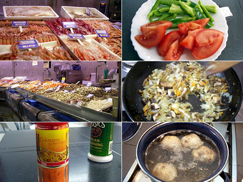 近所のスーパーは魚介類も充実。海老はざりがにも含めたら7種類、貝類も6種類はある。対面販売だから100gずつという買い方ができるのもナーイス!魚介類とトマトとピーマンは後から上に乗せるとして、まず玉ねぎとマッシュルームを炒め、鶏を煮てブイヨンを取る。米を炒めて、炒めた玉ねぎとマッシュルームも加えて、そこに鶏ブイヨンスープを加えて煮込む。