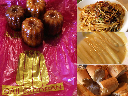 献立:トマトスパゲッティー、白アスパラ、バゲット、デザートにカヌレ