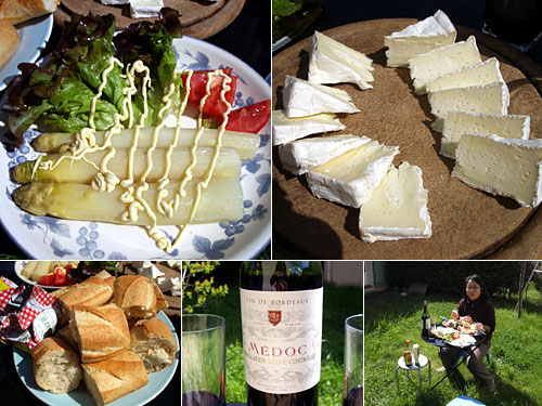 献立:ホワイトアスパラ、サラダ、カマンベールチーズ、バゲット、ワイン