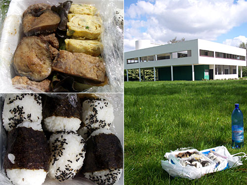 パリ郊外のポワシー市にあるコルビジェのサヴォワ邸を見学。到着時に昼時になったので、持参した弁当を広げて、サヴォワ邸の整然とした近代建築を見ながらおにぎりを頬張った。途中で誰にも止められることなく、最後まで食べられたのでホッとしましたねぇ。こんな有名建築の敷地内でピクニックしていいのかかなり疑問だったもので。へしこは弁当のおかずとしても最適だった。