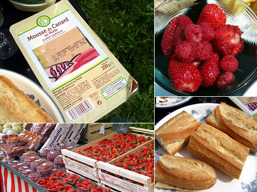 せっかくヨーロッパにいるのだからレバーペーストみたいなパテが食べたいなぁと思っていた。値段は素材と品質によりピンきりだが、今日買ったような鴨のパテや豚のパテはスーパーでEUR0.85〜0.99(200g)。フランスじゃよく食べられているので値段もこなれてる。カリッとして塩味の利いたバゲットにぬって、赤ワインと一緒に食せば幸せ満点。デザートはいちごとフランボワーズ(木苺)。