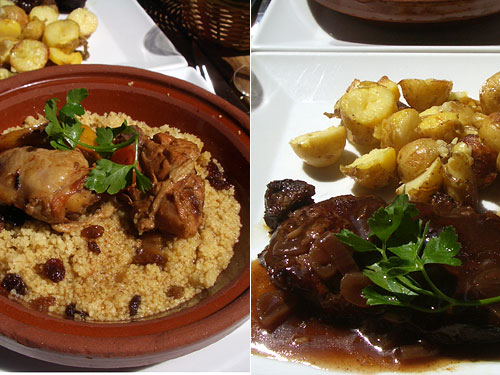 夫は本日のグリルで牛ステーキ。フォンドボーの聞いた玉ねぎ色の赤ワインソースが嫌味のないワインの風味で、肉も柔らかい。付け合せはジャガイモのオーブン焼き。で私のTagine de poulet aux citrons confits et fine semouleはpouletがチキンというだけわかって注文。後でタジンとはモロッコ料理だと知った。クスクスとレーズンを下にしいてシロップ漬けのレモンピールを添えてあった。肉はシナモンが利いて甘みのある風味。
