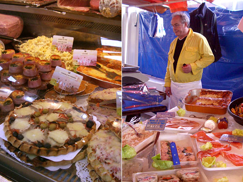 先日のランチに触発されて、自宅でフルコースやってみようということになった。マルシェで今まで振り向きもしなかった総菜屋さんを物色。あるある、ジュレ(ゼリー)固めのや、パテがたくさん。私は卵の入ったジュレにした。EUR1.3は手間の割りにお買い得だ。夫は魚屋を物色。ここでサーモンのにこごりを購入。こちらは150gでEUR5.6とかなり高価。さて、お味はどんなものだろうか。