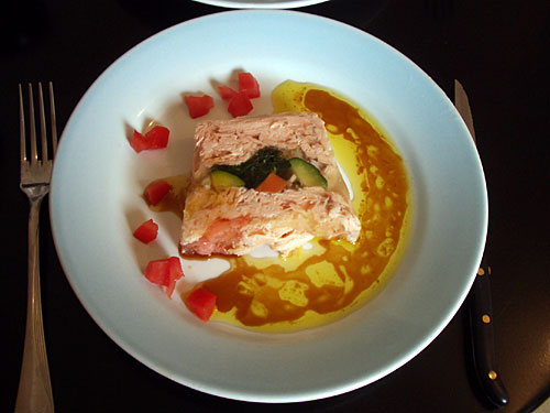 サーモンの身と身の間にきゅうりと人参とわかめを挟んで、ゼラチンで固めたものの薄切りだった。これに、醤油とわさびとオリーブオイルのソースを合わせ、飾りにはトマトを小さく刻んだものをつけた。ま、この装飾は先日食べた昼食を真似たんだけどね。サーモンはさっぱりとしていて、和食といっても過言ではないような味だ。醤油とわさびのソースにしてよかった。醤油を入れすぎてしょっぱいと夫からクレーム有。