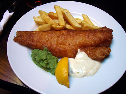 ユーロスターでたっぷりとした朝食を食べてきたので、我々はフィッシュ&チップスを1つ注文してシェアすることにした。定番中の定番といわれるイギリス料理で、マッシュピー(グリーンピース)、フライドポテト、タルタルソースという組み合わせも定番らしい。魚は白身魚でタラやヒラメを使うらしいが、ここのは形と味からタラだろう。ボリュームがあるので、こればかりを1人で食べるのはちと厳しいが、おいしかった。