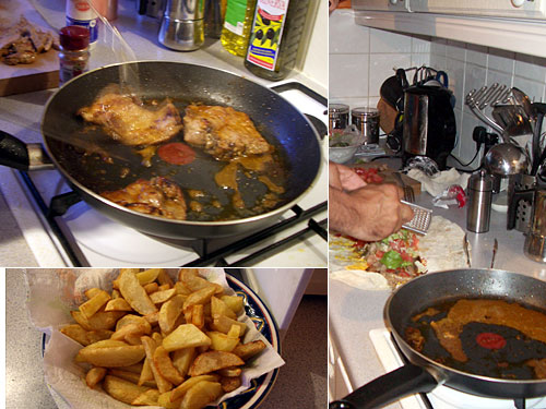 肉が焼けるまでの間にレタスとトマトを切り、いつの間にかフライドポテトも作ってしまった手際の良さには驚かされる。フライパンから取り出した肉を細切りにして、先ほどのペーストを塗った生地の上に乗せる。肉の上には野菜類、そしてチーズをおろしながら振り掛ける。この間にフライパンで煮詰めていた肉汁がいい感じに仕上がってきている。最後に上から肉汁をかけ、太巻きよろしくくるくるっと巻いて出来上がり。