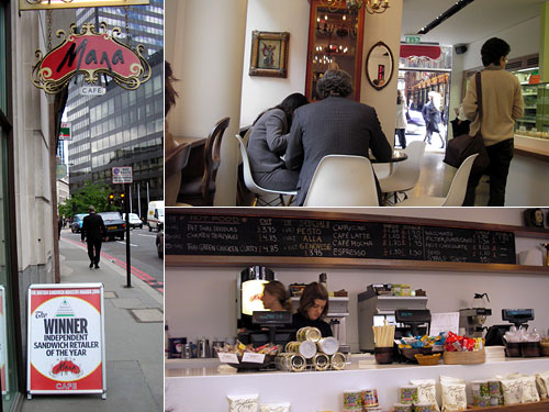 渋い背広姿の男が行き交うCITIの昼時、ヘルシーをテーマにスシとタイ料理とサンドイッチを扱うファストフードの店で昼食。今時は健康志向なのかピンストの男たちもここでサラダなどを食べていた。店は入って両側にサラダやスシやサンドイッチのコーナーがあり、その奥がダイニングとてんぷらうどんや味噌汁を注文するカウンター、一番奥のクローズされた所にキッチンがあるようだ。