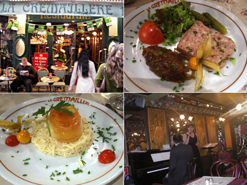 ロンドンからの帰りのユーロスターで向かい合わせの席に座ったカップルから夕食に誘われた。今回のパリでの滞在は3日という彼らが選んだのは、モンマルトルの丘のあの画家がたくさんいる公園に面したレストラン。前菜には私はパテ。あめ色になったオニオンソテーとレタスとトマトとピクルスとほおずき。夫はサーモンのジュレで下にパリパリした野菜の千切り。。ピアノ演奏とシャンソン歌手も出てきて雰囲気が盛り上がる。