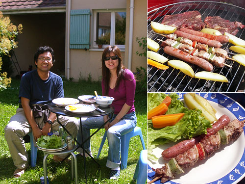 今日もBBQのランチ。水曜日がお休みの家主のスージーさんも一緒にお庭でランチ。今日のメニューは牛肉ステーキ、ソーセージ、七面鳥の串焼き。串焼きはスーパーの出来合い。間にベーコンと緑と赤のピーマンがはさんである。あとは茹でたじゃがいもと人参も乗せて焼く。スージーさんは牛タンのテリーヌ持参で参加。今度の日曜日に、またBBQをやろうと盛り上がる。BBQセットの持ち主のパトリスは出張中。持ち主なしで話は進む。