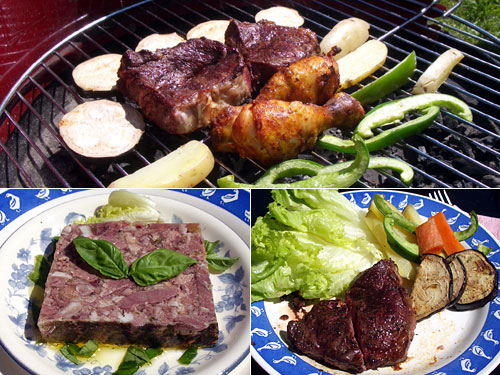 今日の前菜はタンのテリーヌ。スーパーでは、この倍の幅の大きな塊から好きな厚さに切り出して量り売りしてもらう。タンだけのテリーヌは1kgEUR15くらいしているので、この大きさに換算するとEUR2.25(=US$2.92)になるが、今回購入したのはタン以外にも耳も入っているようで1kgEUR7.5くらい。この大きさでEUR1.13(=US$1.47)とずっとお値打ちになる。味もまずまず。こんな前菜だと、赤ワインが欲しいところ。