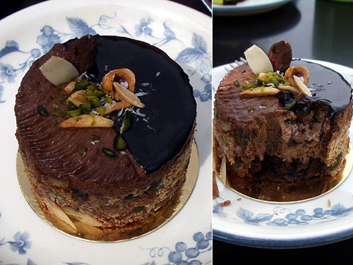 わたしが選んだのはMagie Noire(黒の魔術)。周囲の2mmのスポンジにはピスタチオやアーモンドがぎっしり。一口ごとに香ばしい。上にはココアスポンジに2種類のチョコをかけて、ナッツとピスタチオとアーモンドでトッピング。中はナッツ入りコーヒームースと一番下にしっとりしたココアスポンジなのだが、ケーキの中央にナッツ入りチョコの塊が入っている。マジックの名にふさわしいお楽しみ入りケーキ。1個EUR3.9(=US$4.94)。