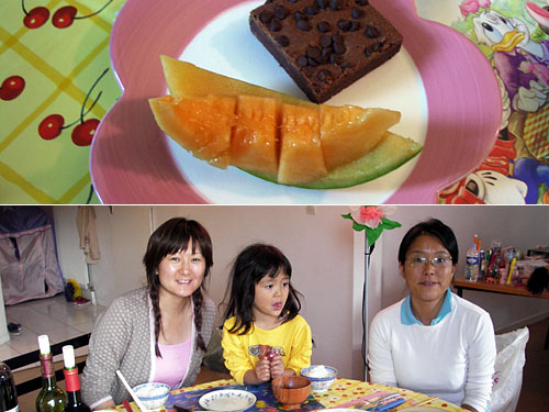 今日の食材は持ち寄りだったけど、スージーさんは最後のデザートまで用意してくれていた。熟したメロンとチョコレートケーキ。もっちりとしたチョコレート味のケーキで、上にもチョコの粒が乗っている。もっちりとした部分は日本の餡子にも似ていて、フランス版のおまんじゅうのようだなぁと思いながら頂いた。スージーさんは日本茶、夫はコーヒー、私は紅茶とそれぞれ好きな飲み物で楽しむ。ここでの生活はいつもこんな感じ。気楽に、自由に。