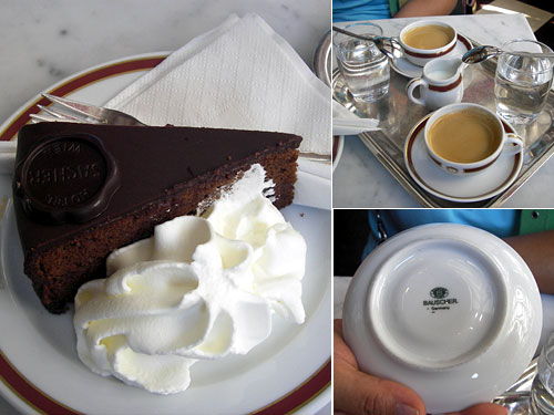 ザッハートルテは、チョコレート味のスポンジケーキに厚めのチョコレートコーティングをしたケーキで、甘みを抑えたホイップクリームが横についてきた。コーティングのチョコは非常に甘いがスポンジは極甘でもない。すっかり観光スポットらしく、おっさんからお姉さんまで皆このトルテを召し上がっていた。素朴だからこそ又食べたくなる、そんなケーキ。器の裏にはBausacherと書かれていてオリジナルか?