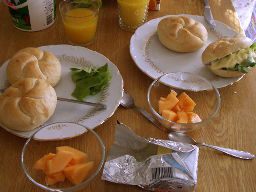 食パンは今ひとつ、トルコパンもモサモサする。で第三弾は地元でよく食べられているパン、ゼンメルsemmelにした。ドイツでいうブロットヒェ−ンで、写真のように丸くて上に弓形の刻みが入っているのを特にカイザーゼンメルKaiser Semmelというようだ。塩味で身がつまって重め。なーんだ、これおいしいじゃん。一個EUR0.15と値段もいい。定番にするか?